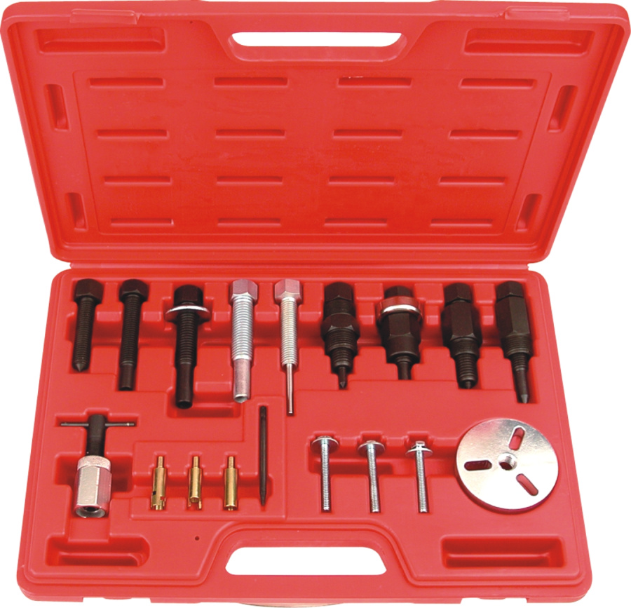 Комплект содержит полный набор муфт для съёма и установки шкивов компрессора кондиционера , вины, адаптеры.