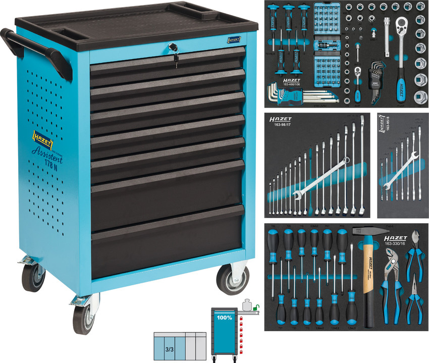 HAZET Тележка инструментальная 7 ящиков,синяя, с набором инструментов 147 предметов